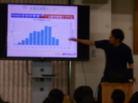小川小学校にも屋根に太陽光発電のパネルがあり、そこで太陽光発電がされているお話をお聞きしました。そこで集めたエネルギーは、一階のろうかにあるモニターで常に表示されています。